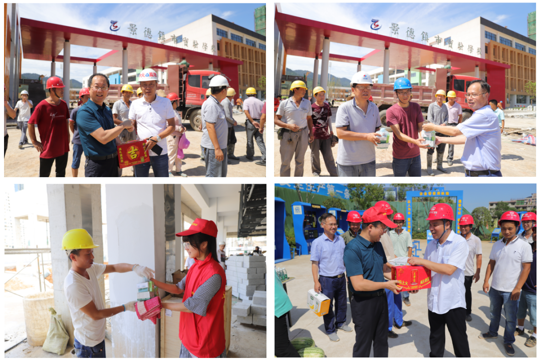 活動中集團(tuán)工會主席邵徽彥、副主席汪琪帶領(lǐng)來自各子公司的十余名志愿者攜帶涼感毛巾、涼茶、水果等各類防暑降溫用品來到康養(yǎng)社區(qū)、白鷺學(xué)校、麻園嶺排澇站、老舊小區(qū)改造等項目施工現(xiàn)場為廣大一線工作人員送去誠摯的慰問,感謝他們?yōu)楸U霞瘓F(tuán)各大重要項目建設(shè)所做出的貢獻(xiàn),同時要求各項目管理人員要時刻關(guān)心、關(guān)注現(xiàn)場工作人員,做好防暑降溫預(yù)防工作。親切慰問和關(guān)懷,為在高溫下作業(yè)的員工們帶來了絲絲清涼,更深地感受到了集團(tuán)對員工們的關(guān)心。