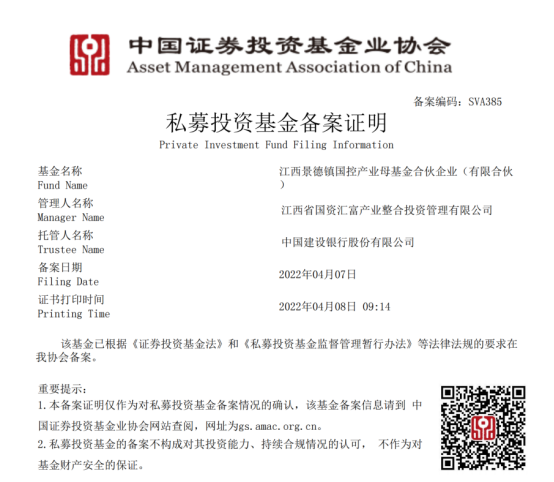 2022年4月7日,由景德鎮(zhèn)國控金融發(fā)展有限公司與江西省國控、昌江區(qū)國資合作發(fā)起組建的江西景德鎮(zhèn)國控產(chǎn)業(yè)母基金合伙企業(yè)(以下簡稱“母基金”)在中國證券投資基金業(yè)協(xié)會成功備案,標志著母基金正式進入投資運作階段。
