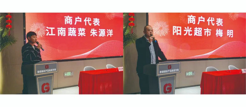 商戶(hù)代表江南蔬菜總經(jīng)理朱源洋、陽(yáng)光超市董事長(zhǎng)梅明發(fā)表了講話(huà)。