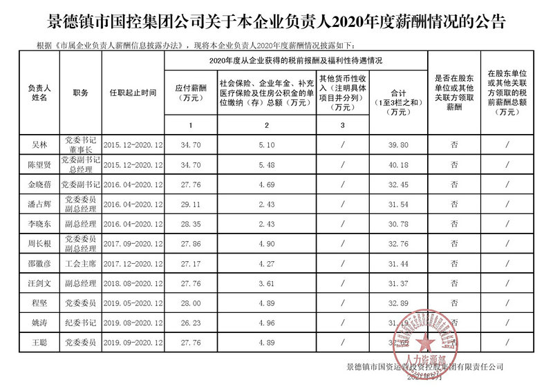 景德鎮(zhèn)市國控集團公司關于本企業(yè)負責人2020年度薪酬情況的公告