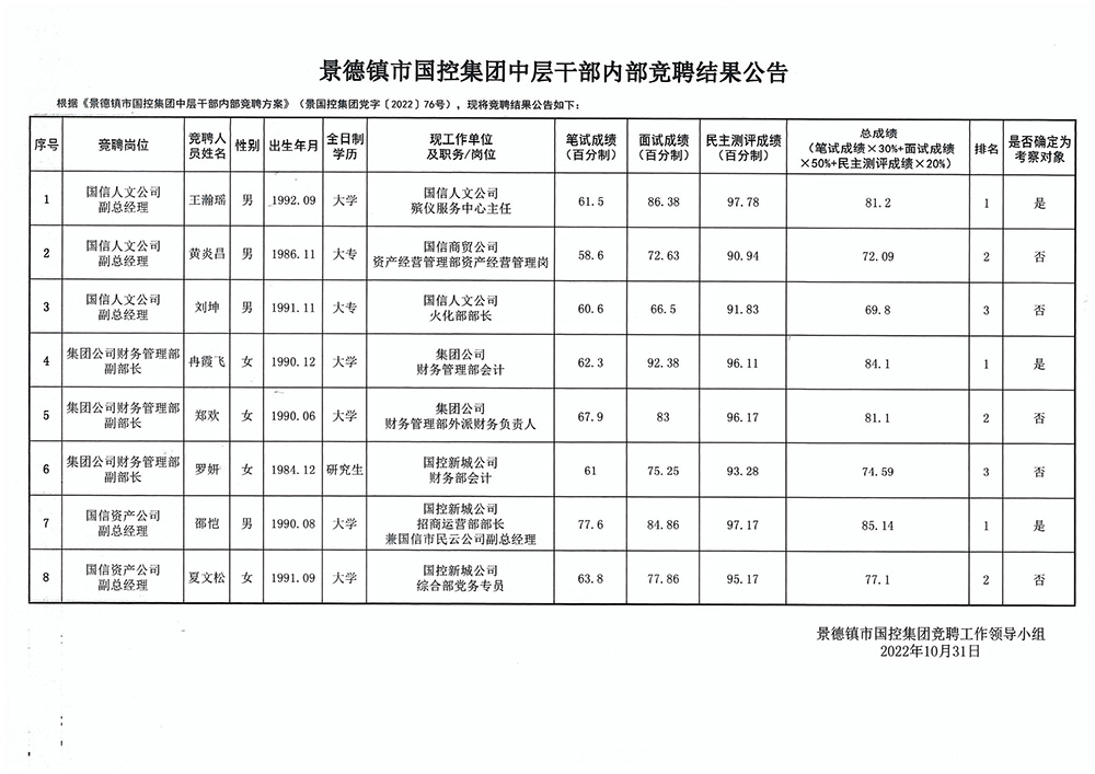 2022年景德鎮(zhèn)市國控集團(tuán)中層干部競聘結(jié)果公告