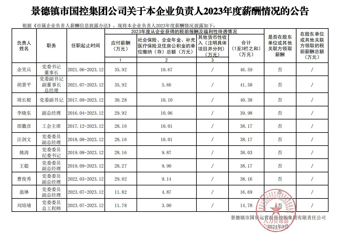 景德鎮(zhèn)市國控集團(tuán)公司關(guān)于本企業(yè)負(fù)責(zé)人2023年度薪酬情況的公告